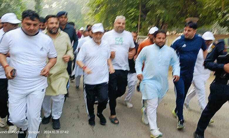 रन फोर यूनिटी में युवाओं के साथ दौड़ते हुए कैबिनेट मंत्री अरविंद शर्मा के साथ सोनीपत विधायक निखिल मदान व गन्नौर विधायक देवेन्द्र कादियान ने शहरवासियों को दिया एकता का संदेश
