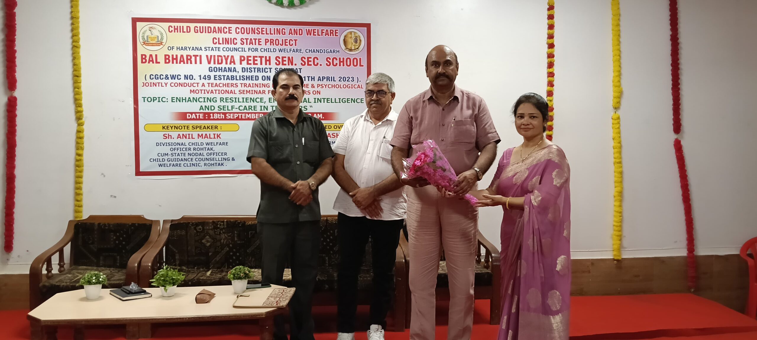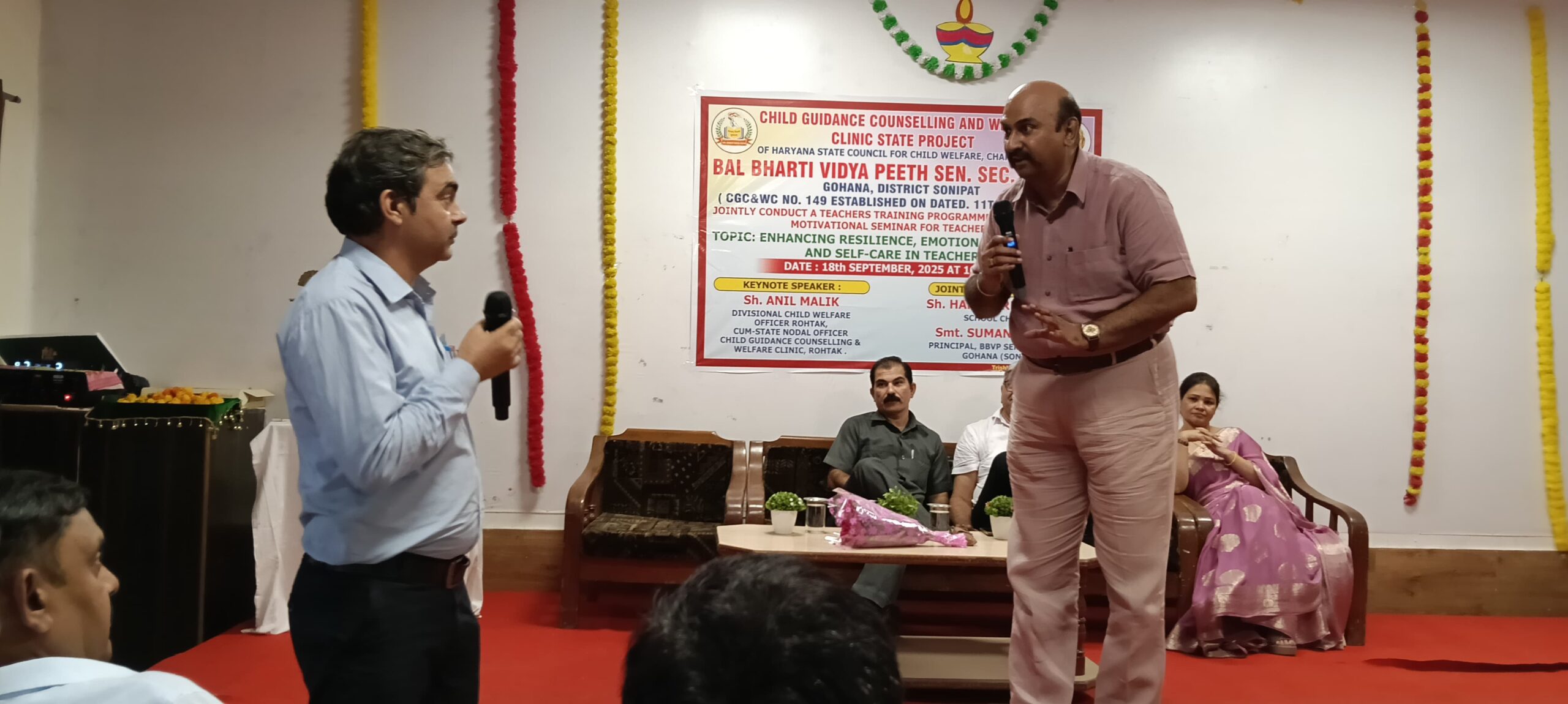 हरियाणा राज्य बाल कल्याण परिषद द्वारा बाल भारती विद्यापीठ वरिष्ठ माध्यमिक विद्यालय में आज शिक्षकों में लचीलापन, भावनात्मक बुद्धिमत्ता और आत्म-देखभाल को बढ़ाना विषय पर सेमिनार का आयोजन