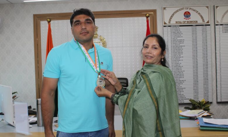 पुलिस आयुक्त सोनीपत ममता सिंह, ने मधुबन में आयोजित ऑल इंडिया पुलिस रेसलिंग क्लस्टर गेम्स में सिल्वर पदक जीतने वाले सहायक उप निरीक्षक विपिन को किया सम्मानित