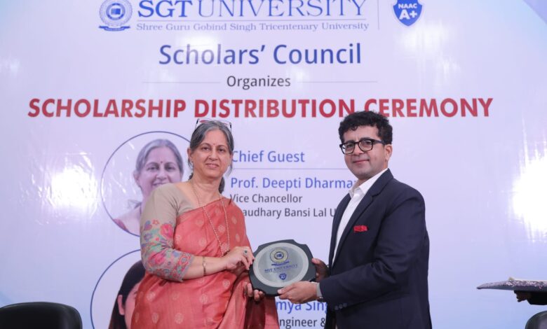 गुरुग्राम, (अनिल जिंदल) 6 फरवरी । श्री गुरु गोबिंद सिंह ट्राई सेंटेनरी यूनिवर्सिटी (एसजीटीयू), गुरुग्राम के परिसर में आज आयोजित मेधा सम्मान समारोह में सैकड़ों प्रतिभाशाली छात्र-छात्राओं के चेहरों पर खुशी, उल्लास और भविष्य के सपने साकार करने का जुनून दिखाई दिया । एसजीटीयू की ओर से उन्हें लाखों रुपये की स्कॉलरशिप वितरित की गई। चौधरी बंसीलाल विश्वविद्यालय की कुलपति और कार्यक्रम की चीफ गेस्ट प्रोफेसर दीप्ति धर्माणी, एसजीटीयू के कुलपति प्रोफेसर (डॉ) हेमंत वर्मा, सॉफ्टवेयर इंजीनियर, जानी-मानी एजुकेटर व ‘गेस्ट ऑफ ऑनर’ सौम्या सिंह की उपस्थिति में स्कॉलरशिप राशि के चेक हाथ में लेकर फोटो खिंचवाते छात्रों ने कामयाबी का लक्ष्य पाने की प्रतिबद्धता दिखाई।