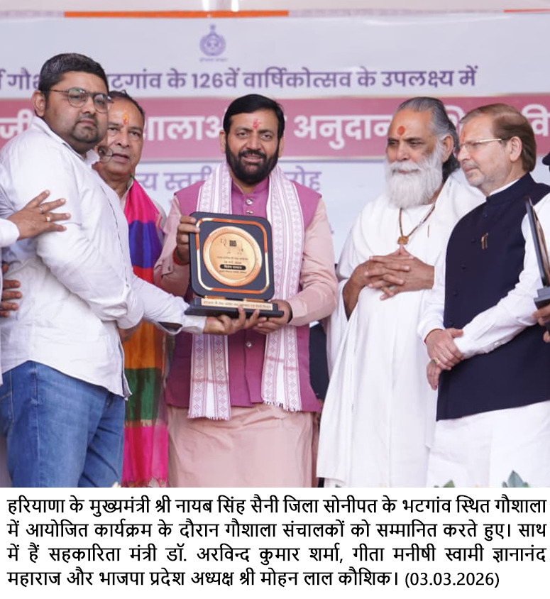 हरियाणा गौ सेवा आयोग के चेयरमैन श्रवण गर्ग ने समारोह को संबोधित करते हुए कहा कि मुख्यमंत्री श्री नायब सिंह सैनी के नेतृत्व में प्रदेश में गौसंरक्षण और गौसंवर्धन के क्षेत्र में ऐतिहासिक कार्य हुए हैं। उन्होंने कहा कि प्रति गाय प्रतिदिन अनुदान की व्यवस्था, गौशालाओं के लिए विशेष बजट प्रावधान, सोलर ऊर्जा, प्राकृतिक खेती और पंचगव्य आधारित उत्पादों को बढ़ावा देने जैसी योजनाओं से गौशालाएं आत्मनिर्भर बनने की दिशा में अग्रसर हैं। उन्होंने कहा कि आयोग का लक्ष्य हरियाणा को बेसहारा गौवंश से मुक्त बनाना है और इसके लिए सरकार, गौशाला समितियों तथा समाज के सहयोग से निरंतर कार्य किया जा रहा है। इस दौरान धर्मार्थ गौशाला भटगांव के प्रधान अनिल दहिया ने मुख्यमंत्री का धन्यवाद करते हुए कहा कि आज उनके गौ सेवा के क्षेत्र में किए जा रहे कार्यों से गौसेवा की भावना एक जनआंदोलन का रूप ले रही है।