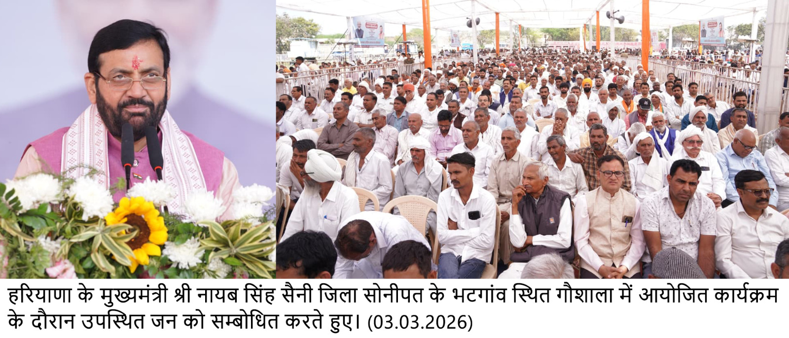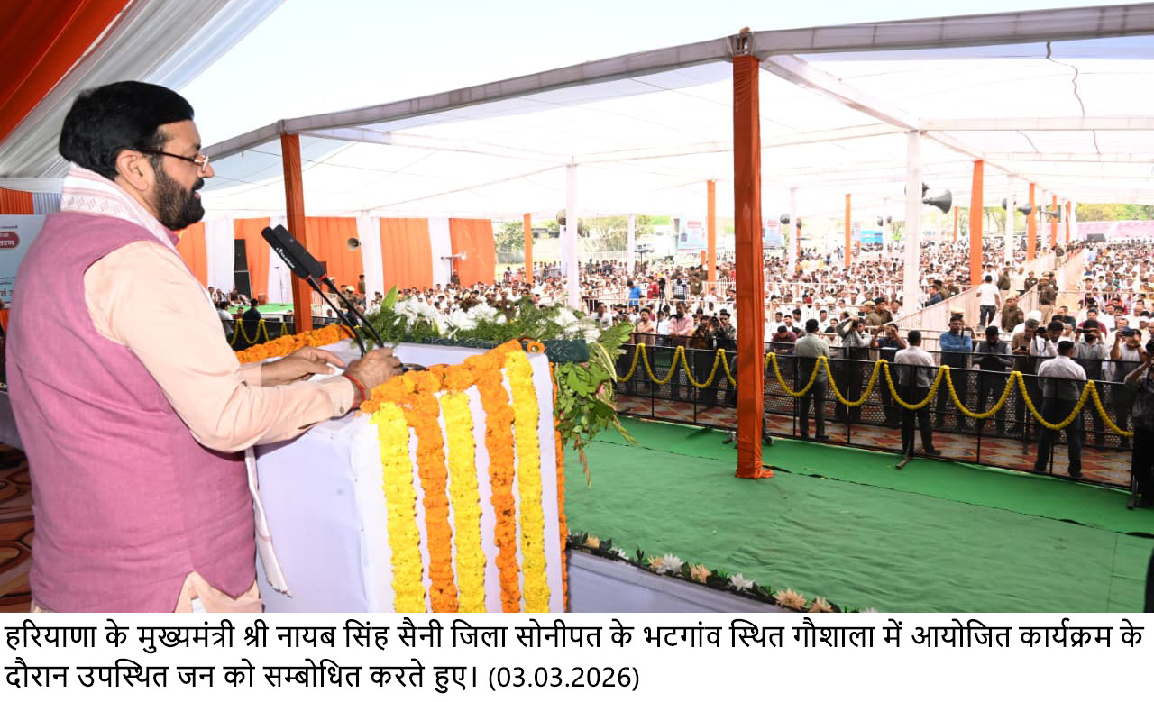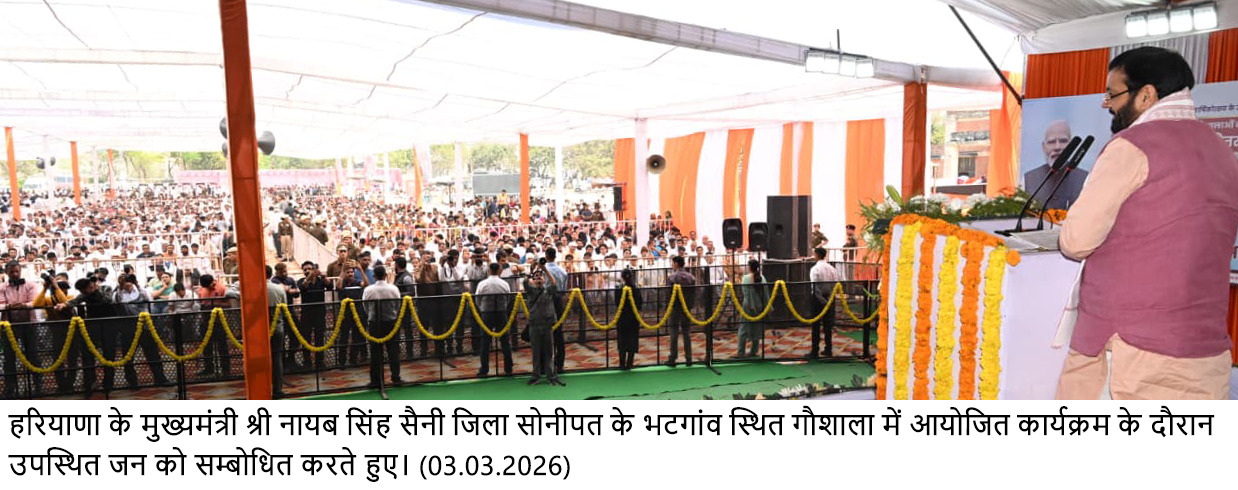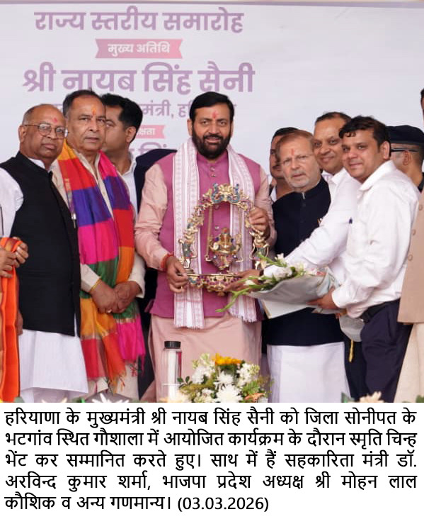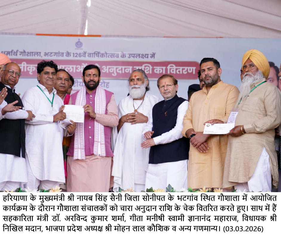 सोनीपत,(अनिल जिंदल) 03 मार्च। हरियाणा के मुख्यमंत्री नायब सिंह सैनी ने जिला सोनीपत के गांव भटगांव में आयोजित राज्यस्तरीय गौशाला चारा अनुदान राशि वितरण समारोह में प्रदेश की गौशालाओं के सशक्तिकरण के लिए 68 करोड़ 34 लाख रुपये की चारा अनुदान राशि जारी की। इस मौके पर मुख्यमंत्री ने प्रदेशवासियों को होली के पर्व की शुभकामनाएं भी दी।