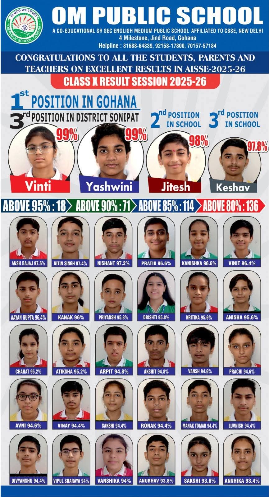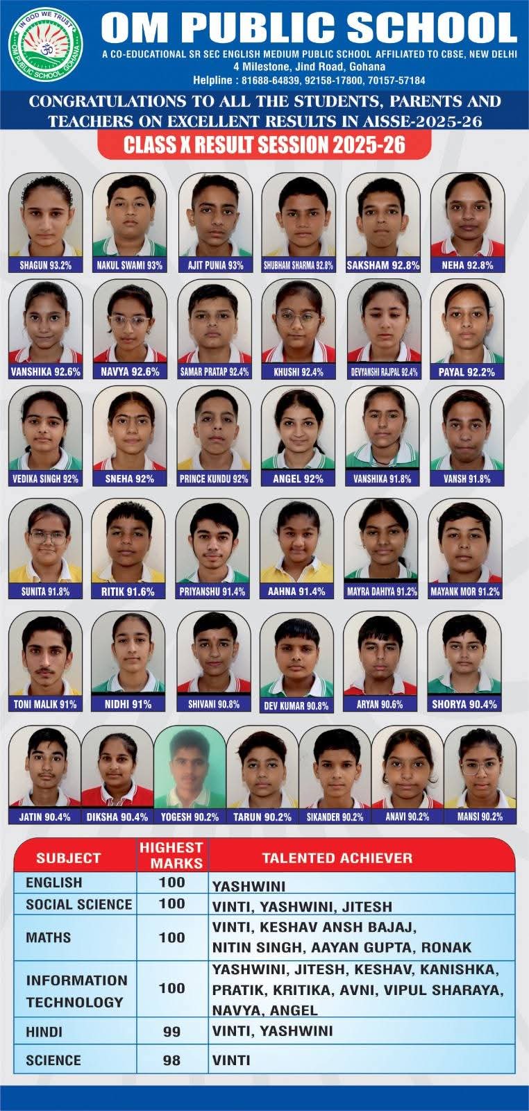 गोहाना, 17 अप्रैल। सी. बी. एस. ई. द्वारा जारी किए गए दसवीं कक्षा के परिक्षा परिणाम में जींद रोड़ स्थित ओम पब्लिक स्कूल के विद्यार्थियों ने स्वर्णिम सफलता हासिल की है। विद्यालय की छात्रा विनती व यशवनी ने 99 प्रतिशत अंक प्राप्त करके सोनीपत जिले में तीसरा स्थान तथा गोहाना उपमंडल में प्रथम स्थान प्राप्त किया। विद्यालय निदेशिका निर्मल लाठर व प्राचार्य डा० मनजीत खासा ने विद्यार्थियो, शिक्षको व अभिभावकों का शुभकामनाएं दी।